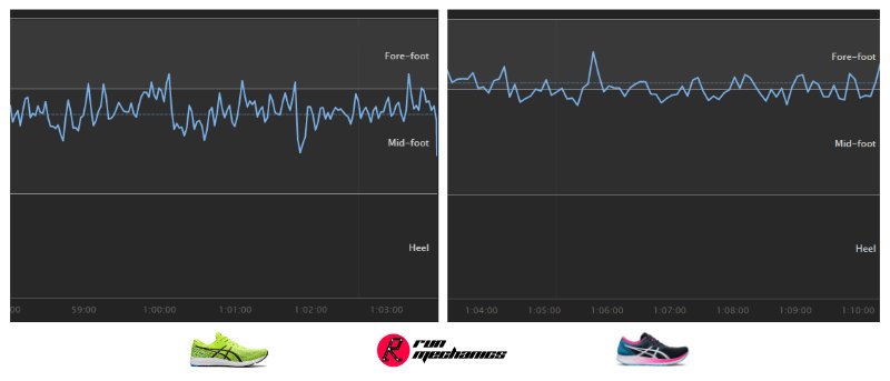 - Interval Runs are when geometry and aggressive toe spring really come into effect. The transition from mid-foot to forefoot is extremely smooth when taking off. The geometry encourages forefoot strike. Here is the foot strike as observed when running in Asics Gel DS Trainer (mid-foot strike) and Asics Hyper Speed (fore-foot strike). (courtesy: runmechanics.in).