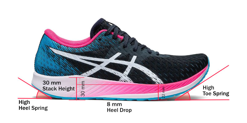 Hyper Speed has a rocker midsole design, with a high stack height and high toe spring.