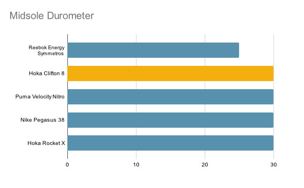 We have measured the softness of the midsoles of few popular daily neutral trainers with a Shore Durometer. In terms of midsole softness Clifton 8 on par with most daily trainers.
