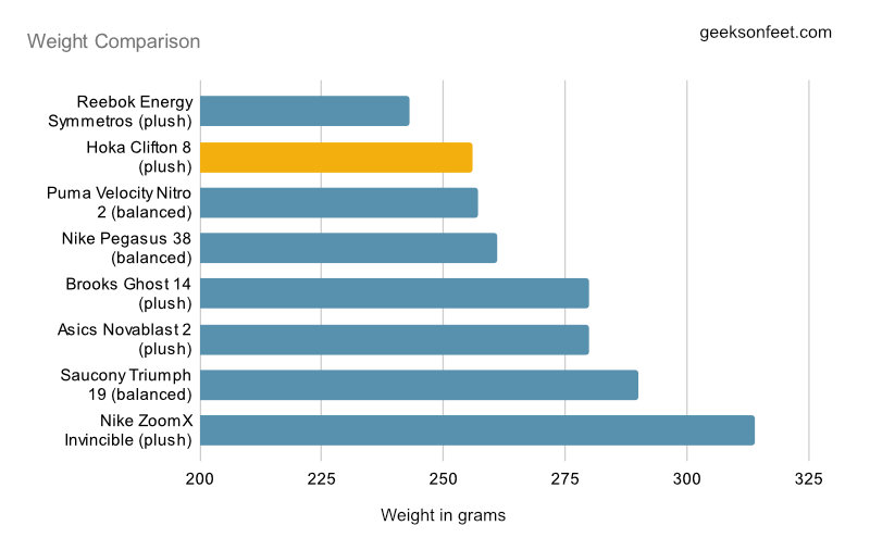 The midsole of Clifton 8 is made of compression-molded EVA (CMEVA) foam. Hoka changed its midsole compound in the eighth iteration to make the shoe 15% lighter than its predecessor. Even though the cushioning is plush, Clifton 8 doesn’t fail on the responsiveness during the ride. We compared it with other balanced cushion daily trainers and trainers that are plush, and the Clifton 8 is evidently lighter compared to other popular trainers like Nike Pegasus 38 and Puma Velocity Nitro 2.
