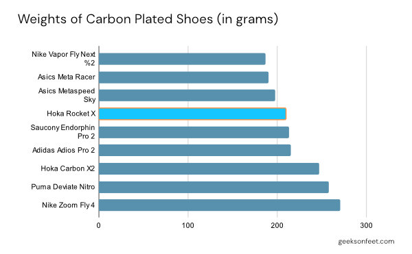 If you are looking for an affordable carbon plated shoe for racing or speed training Hoka Rocket X is highly recommended. It is priced very well when compared to the competition. Rocket X however serves the niche of fast transition, and cannot be compared with premium racers such as VaporFly.SHOEGEEKS SCORE 85