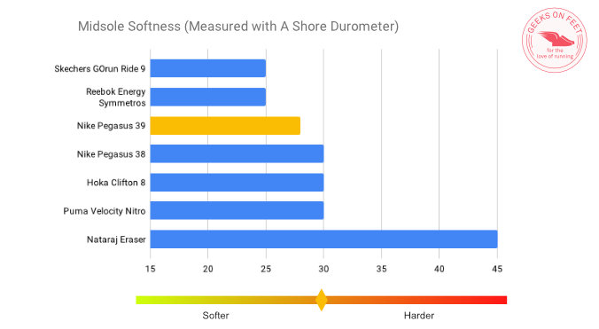 We have measured the softness of the midsoles of a few popular daily neutral trainers with a Shore Durometer. We generally believe Pegasus to be more firm, and hence not soft enough. That’s not the case with Pegasus 39. The durometer score of 28 puts Pegasus in between a firm trainer and a plush trainer. The magic formula Nike has applied in the React foam for Pegasus 39 has made it squishy, and you feel it when you press it.