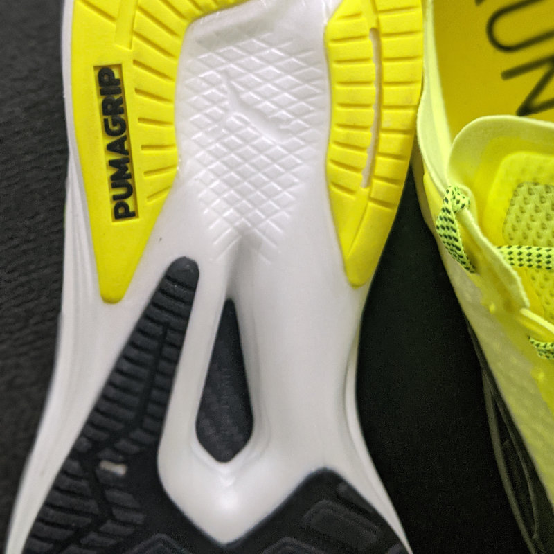 The bottom sole uses "Puma Grip", and is the best in class. It has plenty of rubber, and feels very robust, and offers solid grip on any surface. Bottom sole is cut such that you can see the carbon plate through it.
