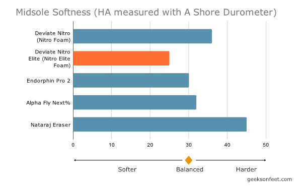 Here is a comparative view of how soft is Nitro Elite's midsole is, when measured the softness with a Durometer. At 25 HA, it is the softest.