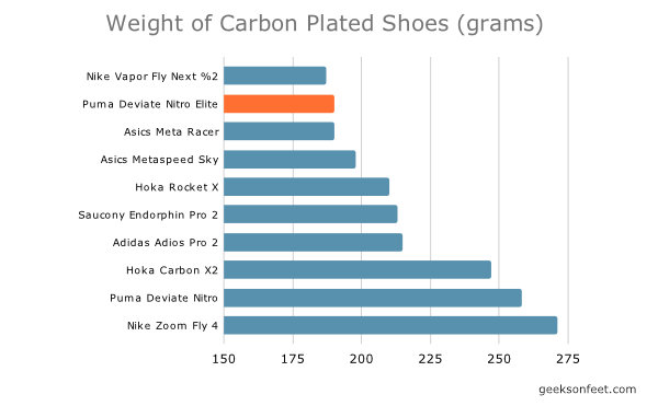 Here is comparative view of weights of all the carbon plated shoes available in India. At 190 grams, it is one of the lightest, next only to VaporFly.