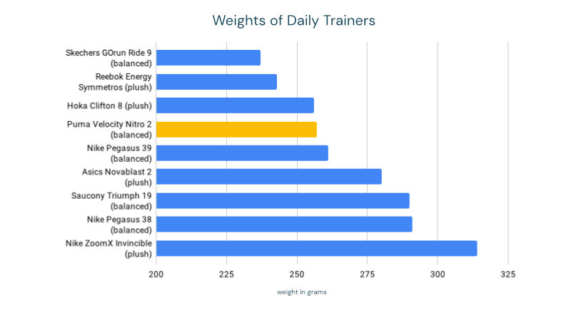 While the published weight is 252 grams (for UK 8), when we measured for UK 10, it is at 292 grams. That puts it as one of the lighter daily trainers. See the comparison with other daily trainers below. When compared to the previous edition, it has shed some weight but is practically unchanged (298g -> 292g).
