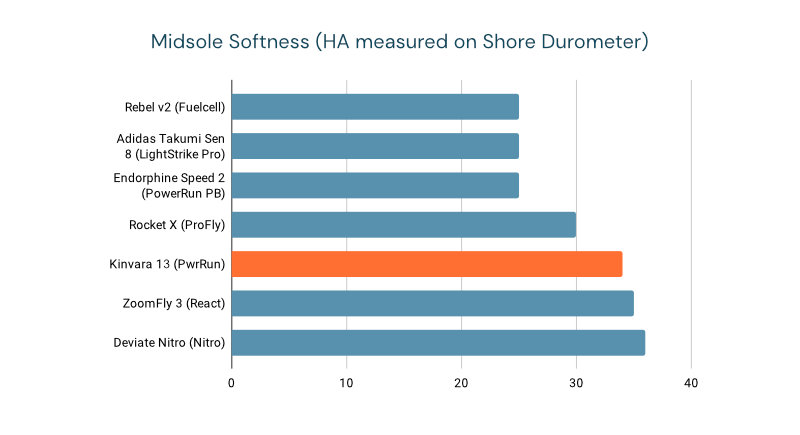 Midsole shape is unchanged from Kinvara 12. If you place the two editions side-by-side, you can hardly find the difference. Like the earlier edition, Kinvara 13 is made of PWRUN Midsole, which is a light-weight blend of EVA. EVA based midsoles are firm, but are very durable. The EVA blend used in Kinvara 13 is much softer compared to the one used in the earlier edition. I’ve measured it at 34 for Kinvara 13, as opposed to 37 for the previous one on the durometer. The durometer matches that of React foam used in Nike ZoomFly. But it is still a far cry from the softness offered by the likes of Saucony Endorphin Speed 2, New Balance Rebel 2 which are in the range of 25-30.