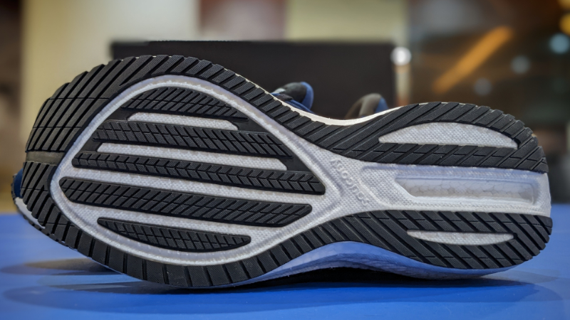 The softness of the cushion varies significantly from the heel to forefoot. The heel feels plusher, and the forefoot is comparatively firmer. The stack height at the heel is measured at 37mm whereas the forefoot is 27mm, hence offering a 10mm drop. The midsole has a deep groove at the heel, which helps it to compress inwards and makes the shoe stable while reducing some weight.